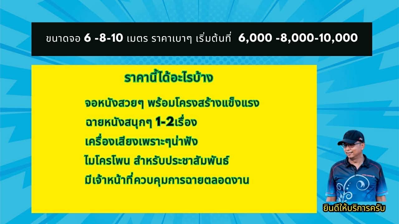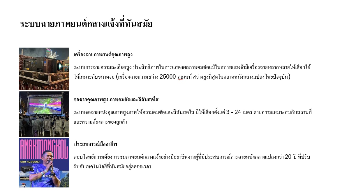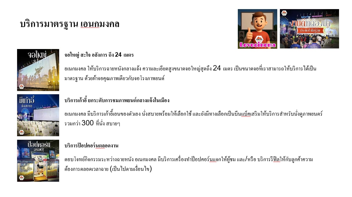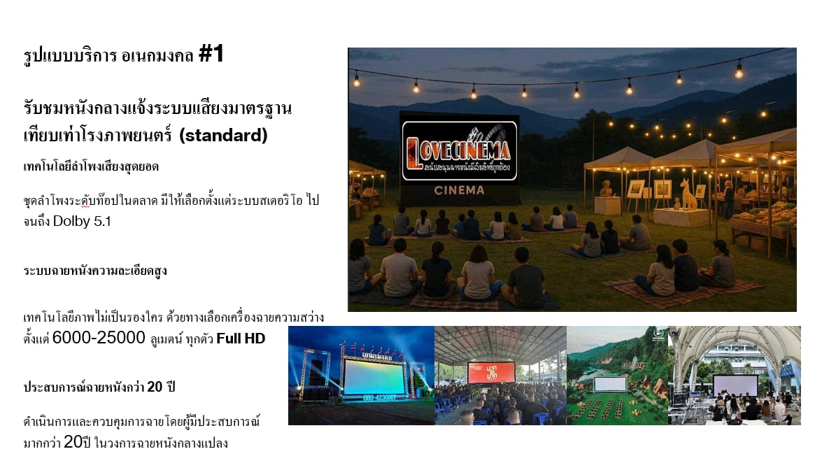 เราให้ บริการฉายหนังกลางแปลง (ติดต่อ พี่เอนก 080-423-0007) ทั้งในเขตเมืองและพื้นที่ต่างจังหวัด ด้วยทีมงานมืออาชีพและอุปกรณ์มาตรฐาน พร้อมดูแลตั้งแต่ติดตั้ง ควบคุมระบบเสียง และจัดการฉายภาพยนตร์ให้คมชัด เรามี บริการฉายหนังกลางแปลง หลากหลายขนาด รองรับทุกความต้องการ ไม่ว่าจะเป็นงานเล็กหรืองานใหญ่