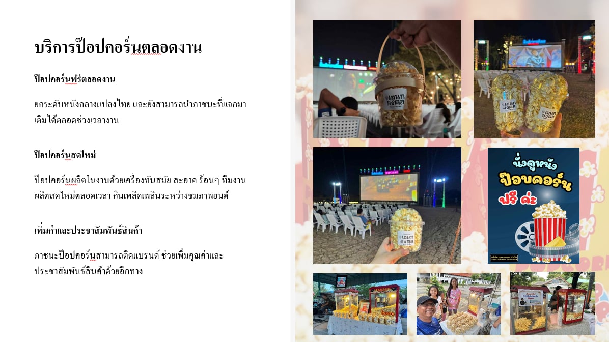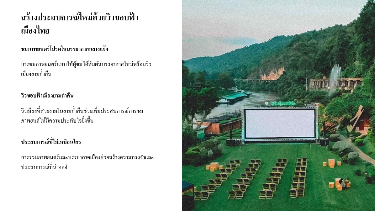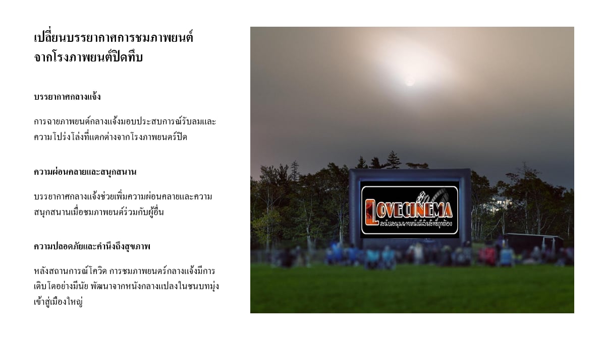 ” มาร่วมสร้างความทรงจำดีๆ สนุกสนานไปกับ หนังดีมีคุณภาพ ในบรรยากาศกลางแจ้ง พร้อมทั้งการจัดการที่ทันสมัยจากอุปกรณ์ฉายหนังระบบดิจิตอลที่คมชัดทั้งภาพและเสียง ไม่ว่าจะเป็นการจัดฉายหนังในงานกิจกรรมต่างๆ หรือเพียงแค่หาความบันเทิงในยามเย็น เราพร้อมให้บริการคุณ ”